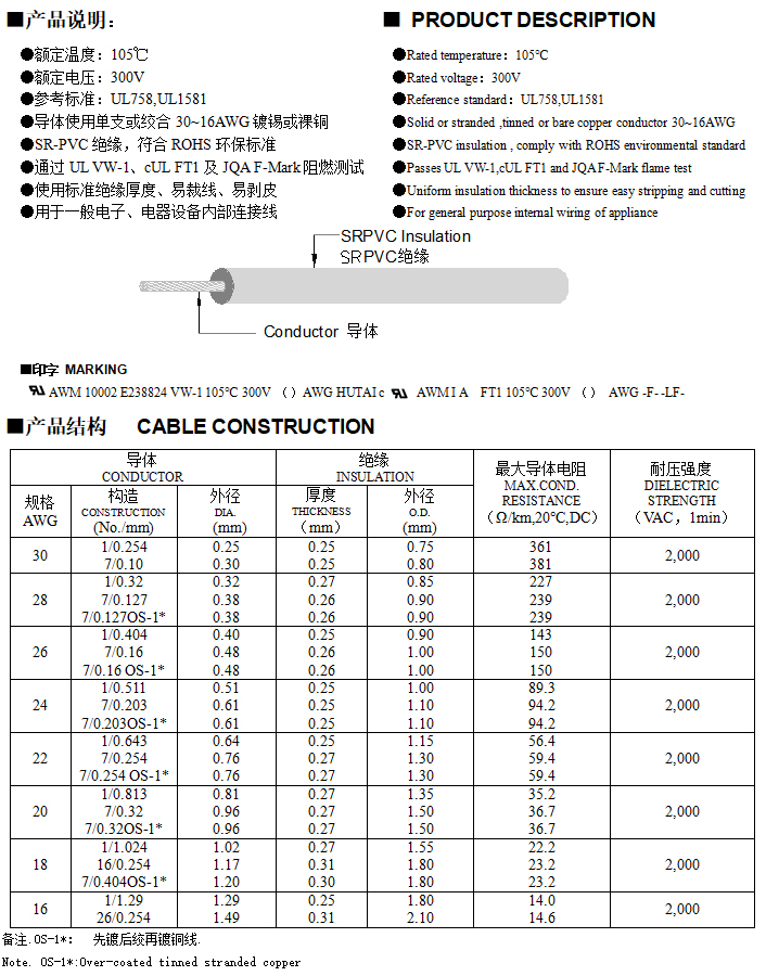 UL 10002 HOOK-UP WIRE 半硬质PVC电子线